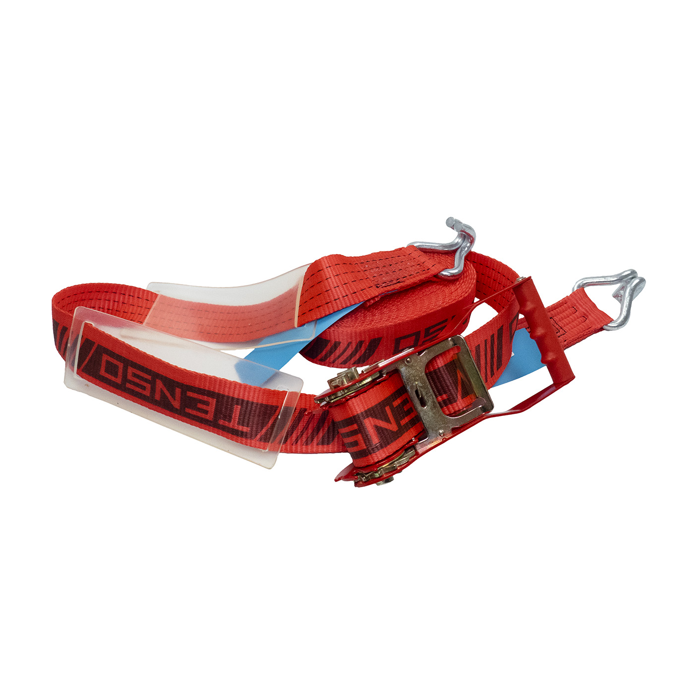 TENSO, patentovaný dvoudílný upínací popruh s ochranou proti povolení nákladu (kompenzuje ztráty v tahu způsobené přepravními podmínkami jako brzdění, zatáčky, vibrace způsobené zhoršeným povrchem vozovky apod.) Pás je vybaven 2 polyuretanovými ochranami.