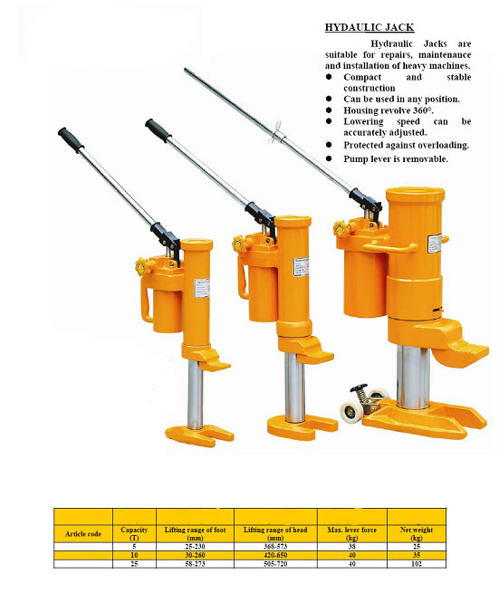 Hydraulický zvedák vhodný pro opravy, údržbu a instalaci těžkých strojů a zařízení. - lze použít v libovolném směru (poloze) - otočné tělo o 360° - možnost přesného nastavení rychlosti spouštění - ochrana proti přetížení - odnímatelná ovládací páka - nosnost na patce je 100 %- Kategorie: Patkové zvedáky
