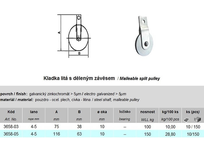 Kladka je určena pro kabely a ocelová lana. Kladka má dělený závěs a je ocelová v povrchové úpravě bílý galvanický zinek. Cívka kladky je litinová