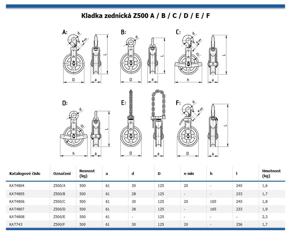 Ke kladkám všech provedení přísluší lano s hákem Z500/L, které není součástí dodávky a je nutno jej objednat zvlášť. Lano Z500/L má průměr 11 mm, základní délka lana je 20 m. Případně lze použít jiné polyamidové nebo konopné lano do průměru 16 mm.