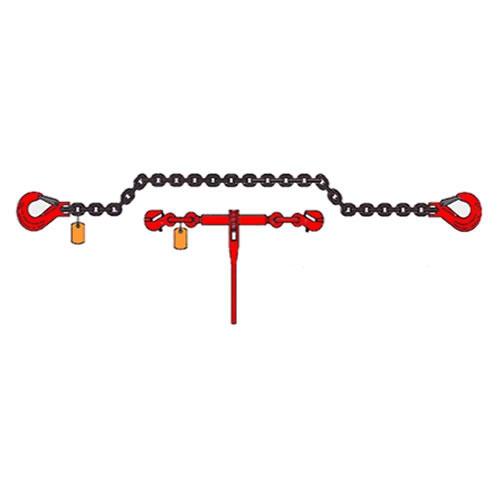 Kotevní řetěz pro zajištění přepravovaných stavebních mechanismů a jiných rozměrných a těžkých břemen. Vyroben z vysokopevnostního řetězu tř. 8, ráčny, háků s pojistkami a zkracovací čelistí pro upravení požadované délky řetězu.Zdvih ráčny je 203 mm