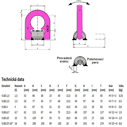 Jsou sklopné o 180° a zatížitelné ve všech směrech bez ztráty nosnosti. Povrch závěsného kruhu je opatřen efektní růžovou práškovou barvou. Kozlík vázacího bodu je z kované oceli 1,0577 + N ( St 52 -3N ), jedná se o odolný materiál, který se dobře svařuje. Nosnost je na kozlíku výrazně vyznačena. Vázací body jsou před expedicí 100% kontrolovány dle EN 1677-1, zda neobsahují trhliny. Mají koeficient bezpečnosti 4.