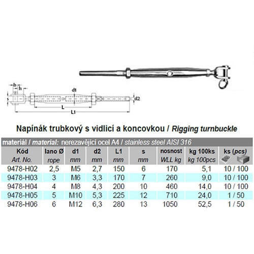 Popis Nerez trubkový napínač vidlice-koncovka 6 mm/M12, A4
