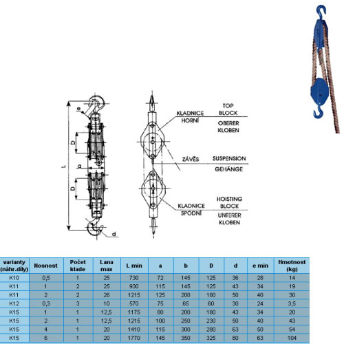 Popis Obecný kladkostroj pro konopné lano K12 0,3 t