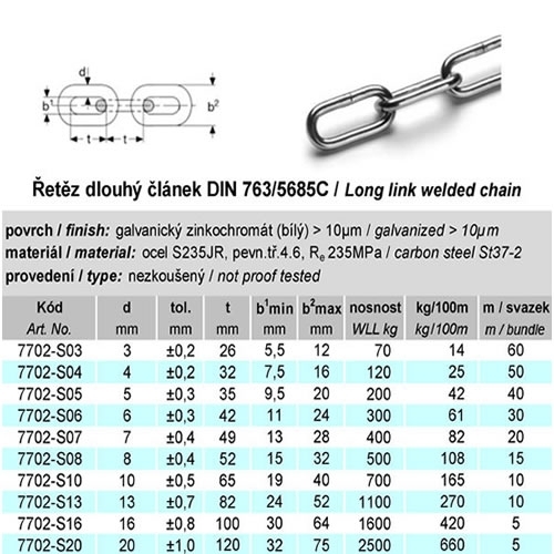 Řetěz dlouhý článek DIN 763/5685C (svařovaný, nezkoušený). Povrchová úprava bílý galvanický zinek.