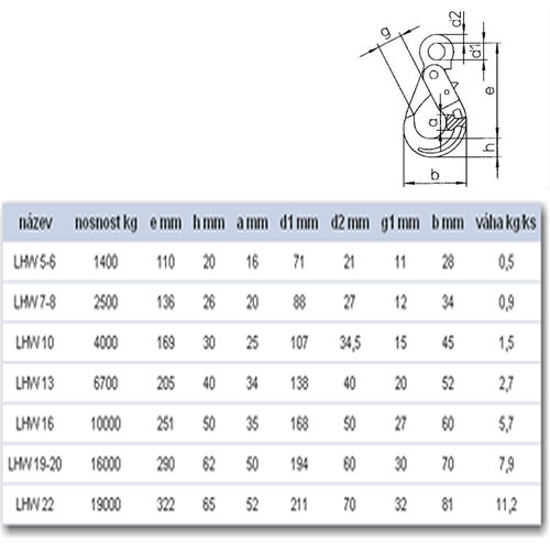 Velké oko, vhodné pro lana a zvedací pásy. Zavírá se a zajiš?uje se automaticky