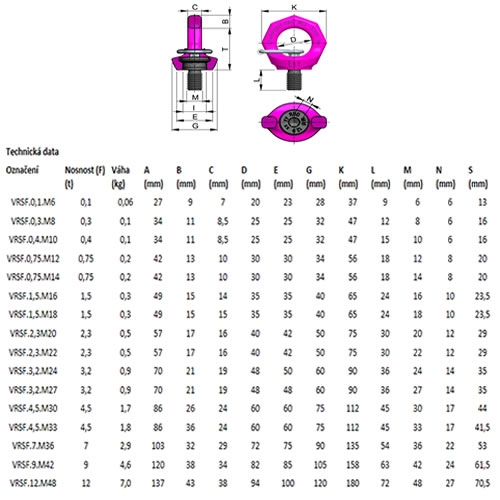 Otočné šroubovací vázací body VRSF se dodávají s klíčem, který usnadňuje montáž vázacího bodu (utažení a povolení středového šroubu). Šroubovací vázací body mají koeficient bezpečnosti 4.