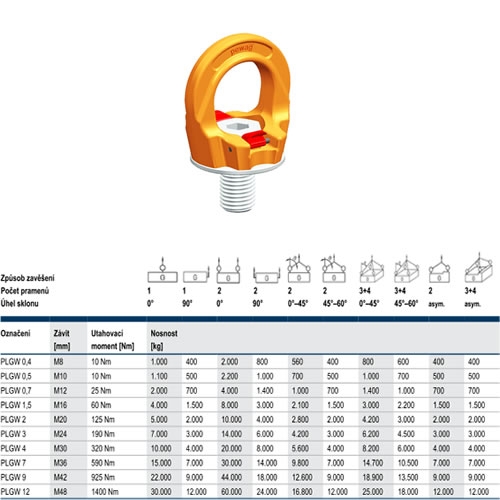 Tabulka s různou maximální nosností v závislosti na typu aplikace v souvislosti s druhem zvedacího zařízení, počtem pramenů a úhlem sklonu, je součástí uživatelské příručky a balení.