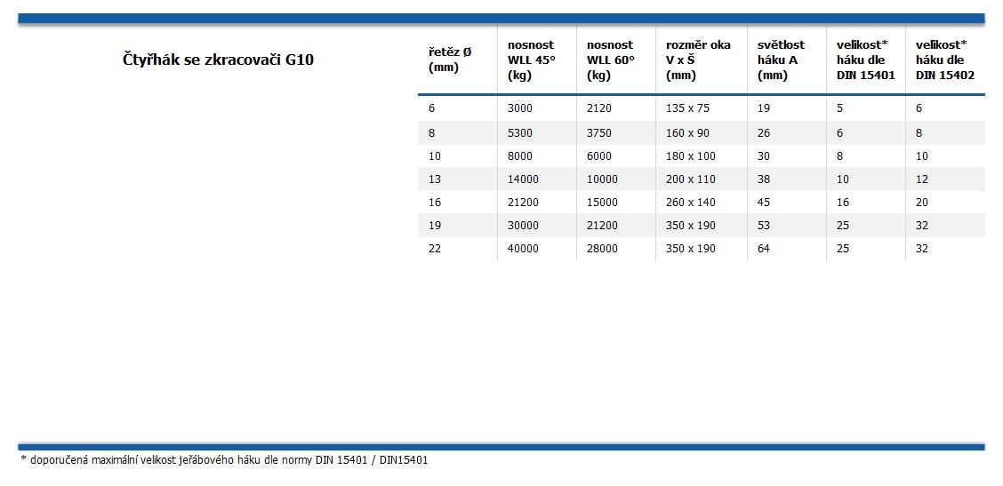 Vázací řetězy pevnostní třídy G10 se vyznačují primárně navýšením nosnosti o 25 % oproti pevnostní třídě G8 (přibližně o 30% lehčí řetěz se shodnou nosností). Díky použití vysokopevnostní oceli jsou obzvláště vhodné do těžkého průmyslu, vystavované ostrým hranám a vysokému opotřebení otěrem. Osazeno zkracovacími háky, díky němuž lze vázat i tvarově atypická břemena a dosáhnout perfektního vystředění těžiště.