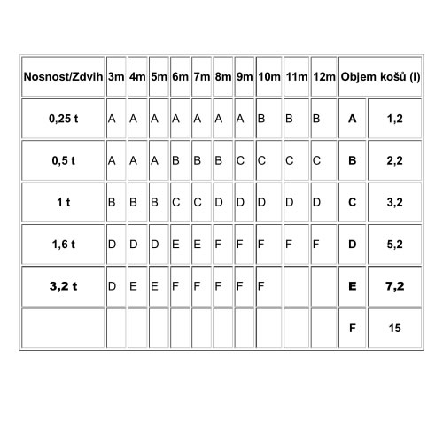 Pro ostatní nosnosti a neuvedené zdvihy lze použít pouze koše plechové.