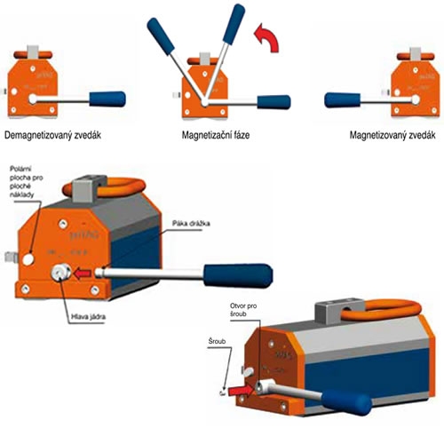 Vyrábějí se s použitím magnetů z neodymu pro uchopování železných materiálů plochého nebo válcového tvaru, zaručujícího náležitý přímý kontakt s magnetem, bez použití dalších nástrojů nebo elektřiny.